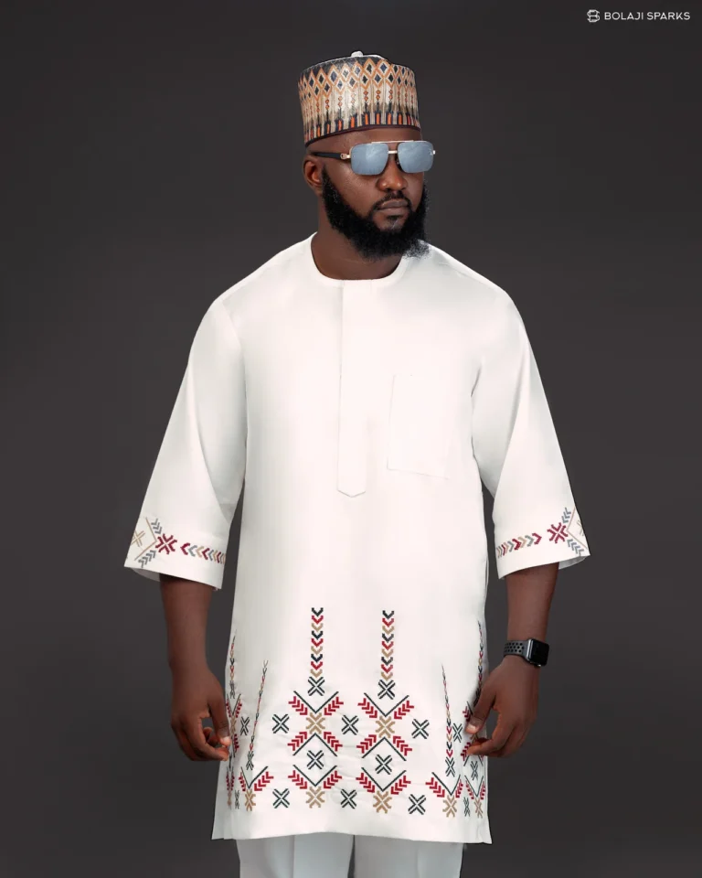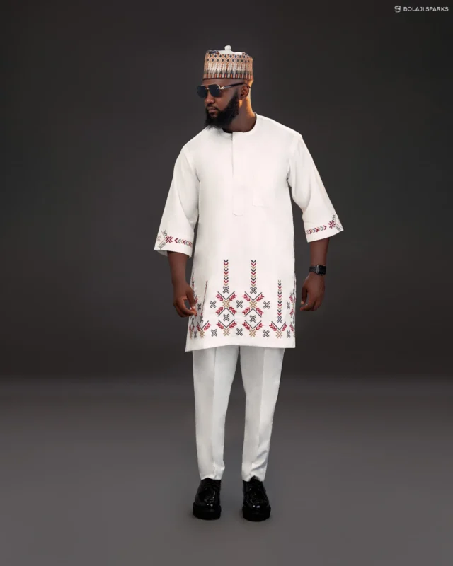 Men’s White Senator Native Wear with Multicolour Hem and Sleeve Embroidery plus Matching Hausa Cap – Elegant African Two-Piece