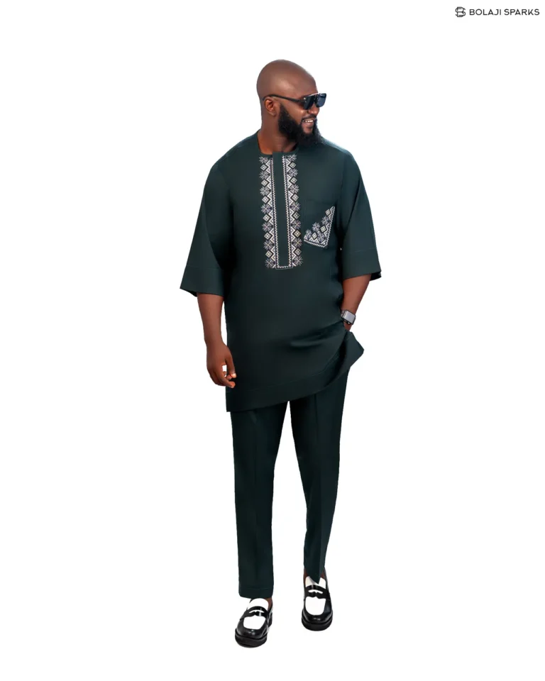₦300,000.00Men’s Deep Green Senator Native Wear with White Geometric Embroidery and Side Pocket