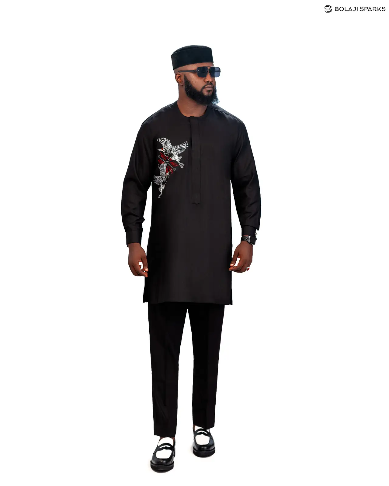 Men’s Black Senator Native Wear with Luxury Bird Embroidery and Matching Cap – Premium Long-Sleeve