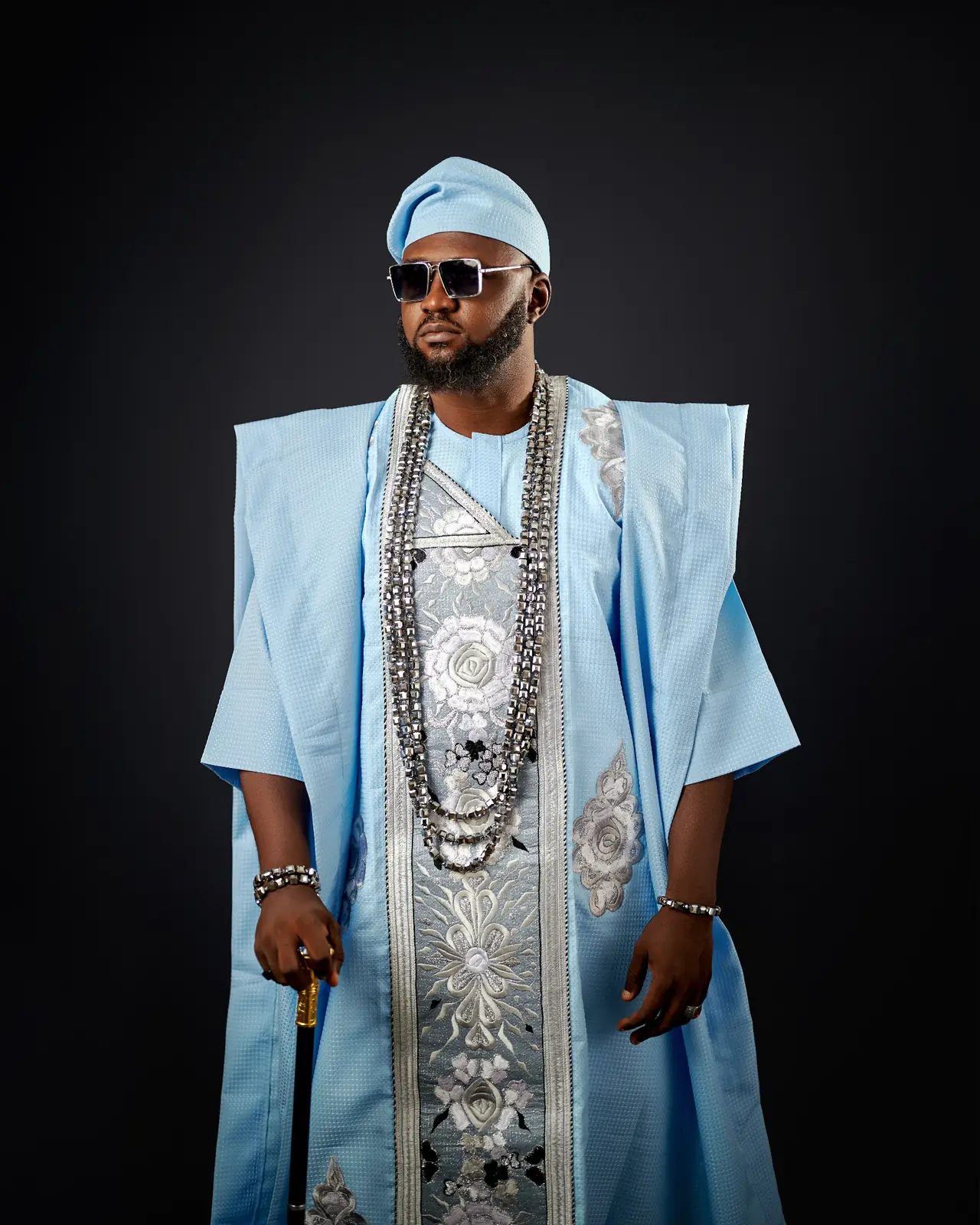 Royal Sky Blue African Men’s Agbada – Luxury Silver Embroidered Traditional Kaftan with Layered Beaded Necklace & Matching Fila Cap